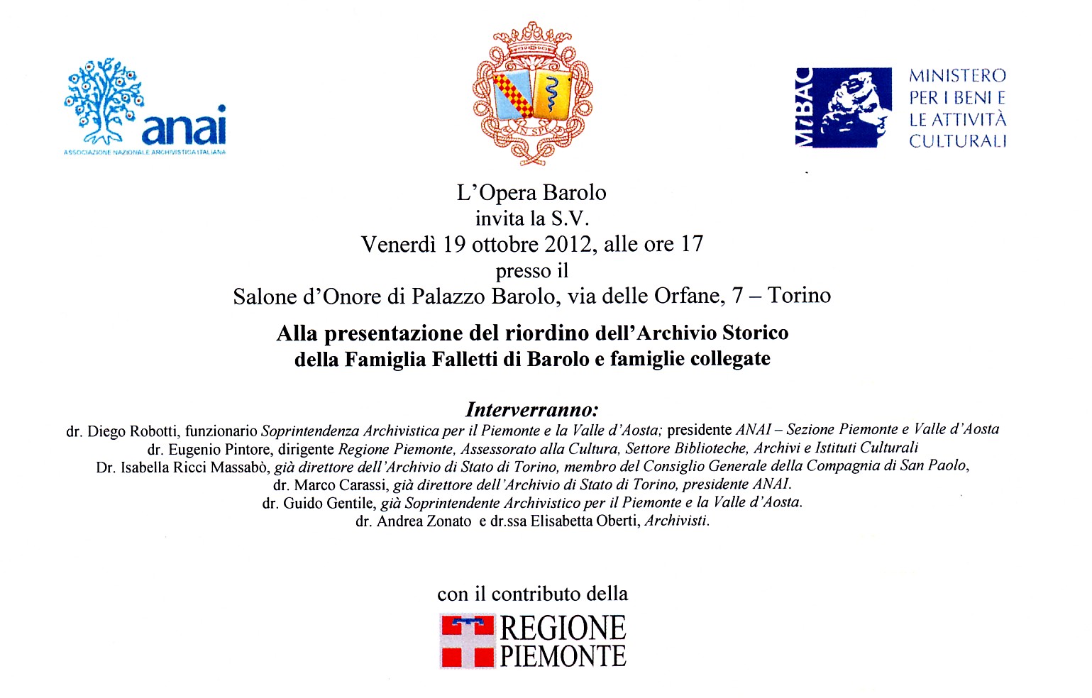 La presentazione del riordino dell'Archivio Storico della Famiglia Falletti di Barolo e famiglie collegate si terrą il prossimo 19 ottobre alle ore 17.00 presso il salone d'onore di Palazzo Barolo, via delle Orfane 7, Torino.